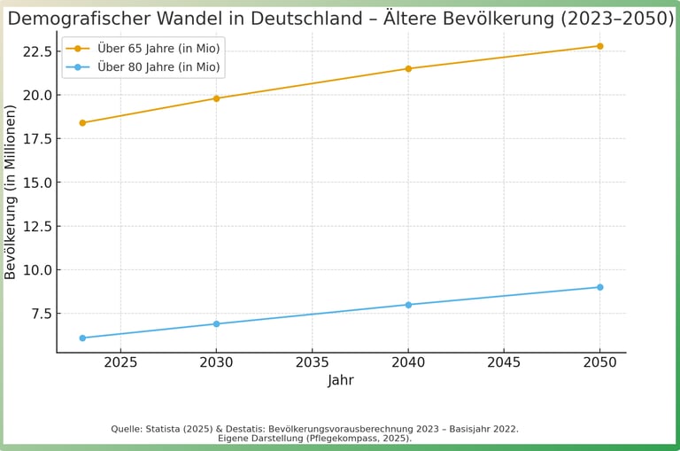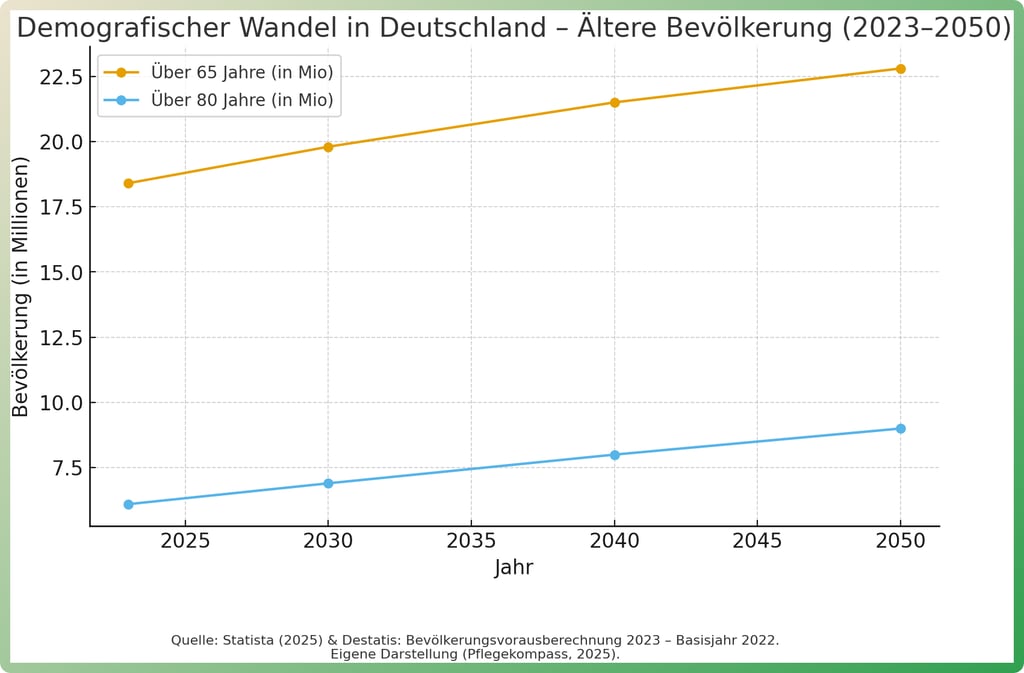 Laut Statistischem Bundesamt (Destatis) leben aktuell (2025) rund 18,4 Millionen Menschen über 65 Jahre in Deutschland – das sind 22,3 % der Gesamtbevölkerung.