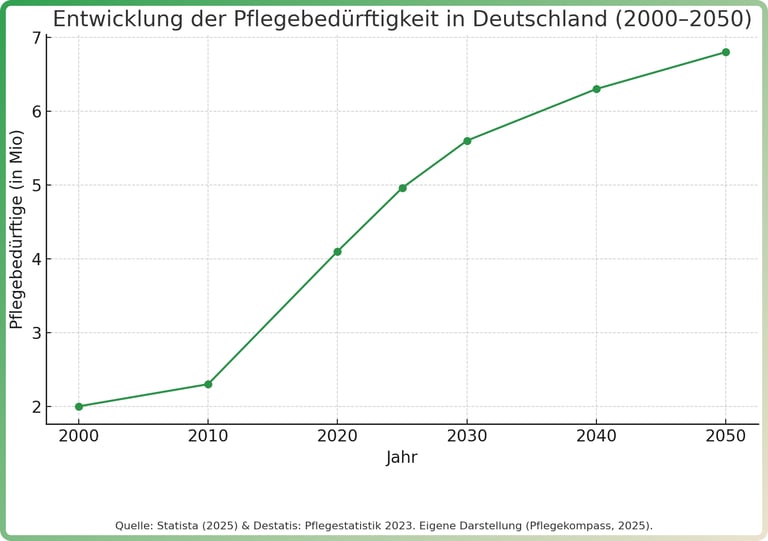 Immer mehr Familien sind betroffen – direkt oder indirekt. Während 1999 noch rund 2 Millionen Menschen pflegebedürftig waren, sind es laut Statistischem Bundesamt heute (2025) bereits 4,96 Millionen.